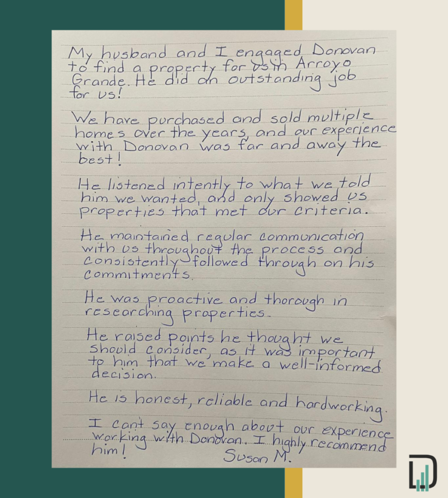 Donovan Loomis is an outstanding realtor. He provided exceptional support throughout our entire journey of selling our home in California. Selling and buying a home can be one of life's most challenging and stressful experiences. While no realtor can promise to eliminate those stresses, Donovan prepared my husband and me by outlining what to expect at every step of the process. His approach is simple: communicate, be truthful, and be honest and trustworthy. Thanks to Donovan's expertise, we had a successful outcome—selling our home for the maximum price with the best terms and the least amount of stress. He is a transparent and reliable agent who demonstrates a deep understanding of the market. His primary goal was clearly to help us achieve our objectives in selling our home.